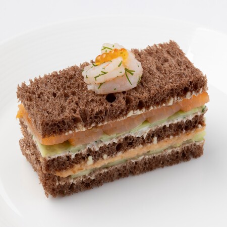 カカオパウダーを練りこんだ食パンと2種類の具材(スモークサーモン&ディルクリーム、サーモンリエット&きゅうり)を重ね、まるでチョコレートケーキ「オペラ」のような見た目に仕上げたサーモンサンドイッチです。トッピングには小えびとフィヨルドルビーをあしらいました。
