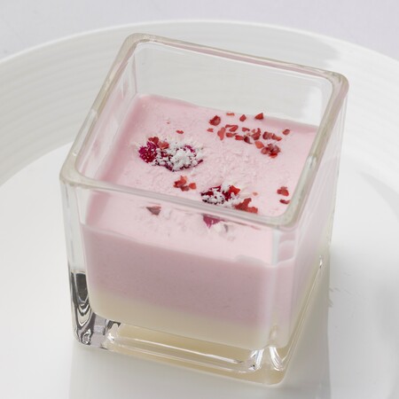 ホワイトチョコレートクリームとビーツのスープが美しい層をなした、甘味と塩味が調和する冷製スープです。仕上げに、ピンクペッパーとホワイトチョコレートをトッピングしました。