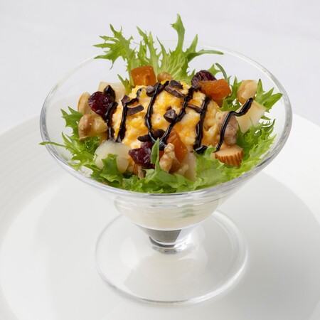 ひよこ豆のムースにトリュフ風味の卵サラダを重ね、スモークホタテやドライアプリコット、ドライクランベリーをのせた上に、食感のアクセントとしてカカオニブやアーモンド、クルミをトッピング。カカオパウダーやバルサミコ酢などを合わせたドレッシングとお楽しみください。