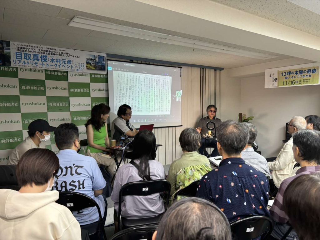 芥川賞作家の目取真俊さん(壇上の右奥)らを招いたトークイベント