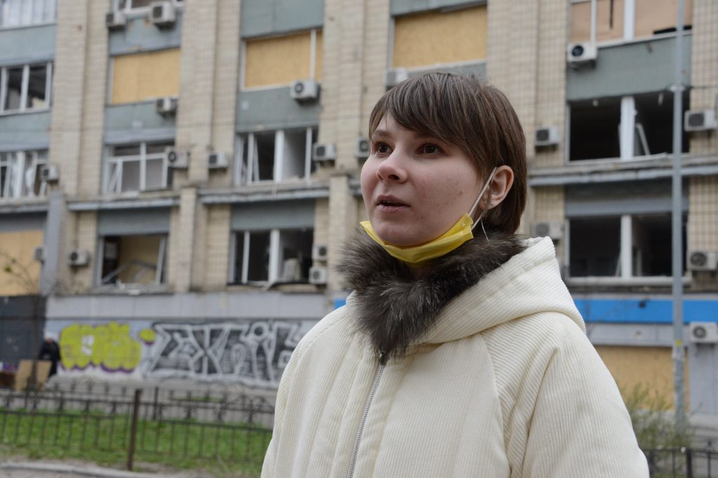 自宅近くの破壊された建物の前で語るリュボフさん(2022年4月、筆者撮影)