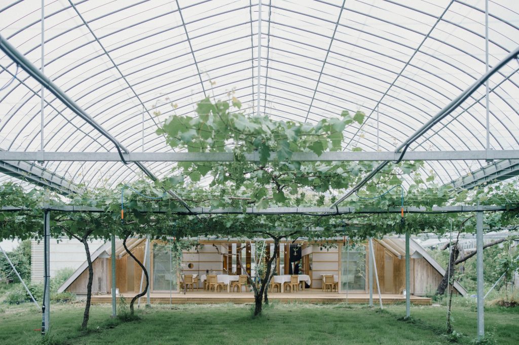 この店の魅力は、食材の地産地消にとどまらず、建築やシェフの背景、大地の恵みが重なり合い、ここでしか出会えない物語を生み出しているところ。例えば、再生可能な紙管を構造材に用いた、温かみと力強さが共存する建物のデザイン。周囲の緑を存分に取り込んだ設計で、屋内にいながら農園の土の香りや風の気配を身体全体で感じることができる。店内にもぶどうの木が引き込まれ、まるでぶどう園の中にいるような気持ちになれる。