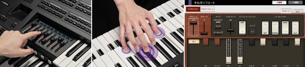 9本のスライダーを搭載(左)、ポリアフタータッチを採用したFSX-i鍵盤(中央)、ヤマハが独自に開発したVCMオルガン音源盤(右)(写真:ヤマハ株式会社提供)