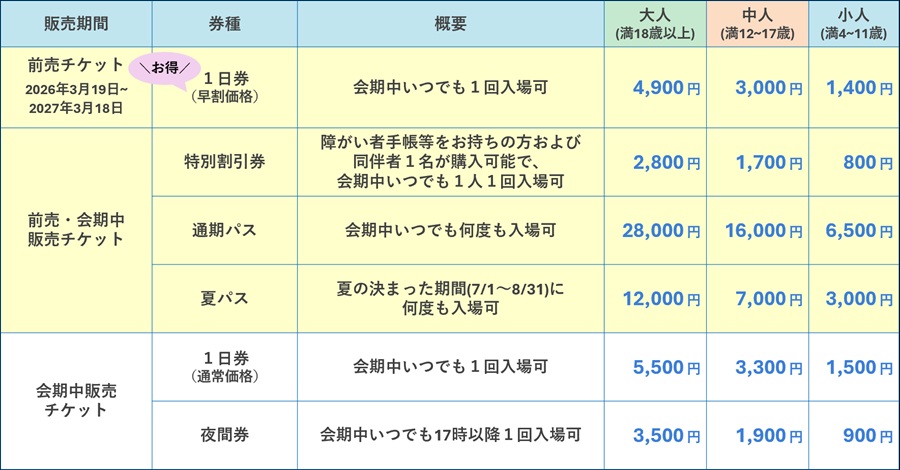 前売りチケットは、お得な早割価格の1日券が、大人(満18歳以上)4900円、中人(満12~17歳)3000円、小人(満4~11歳)1400円。会期中に何度も入場できる通期パスや、夏の決まった期間(7月1日~8月31日)に何度でも入場できる夏パスなども設定している。電子チケットのほか、紙チケット等も用意する予定(追加料金税込みが必要)。購入についての詳細は随時、2027年国際園芸博覧会協会公式ホームページ内のチケットインフォメーションなどで発信していく。
