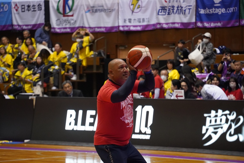 午後からは場所をアリーナへと移し、ラミレスさんは福島ファイヤーボンズ戦のスペシャルプレゼンターとして登場。ハーフタイムのトークショーでは持ち前の明るいキャラクターでブースターの心をつかんだ。
