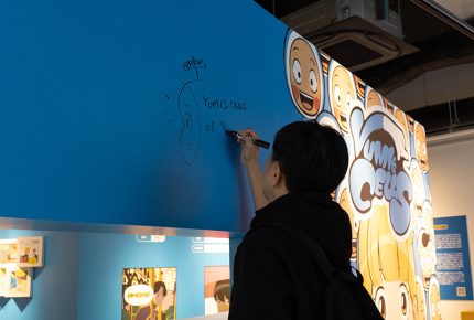 「ユミの細胞たち」の紹介パネルに腹ペコ細胞のイラストを描くイ・ドンゴンさん