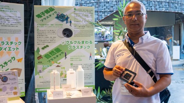 実際に「共創チャレンジ」で参加した企業の一つが、大阪大東市に本社のあるプラスチック製造業のニッポー株式会社。「昨今、プラスチックと聞くだけで逆風だったため、世の中のプラスチックのイメージを変えたかった」と参加理由を語るのは、万博会場でブース出展する山本公一さんだ。