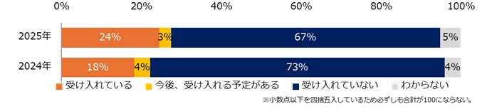 「現在、社外から副業・兼業で働く人を受け入れているか?」との問いには、24%が「受け入れている」と回答し、昨年の調査より6ポイント上昇した。受け入れている理由としては「慢性的な人手不足の解消のため」(53%)、「専門的な知識・スキルを持った人材が必要だから」(51%)などが目立った。