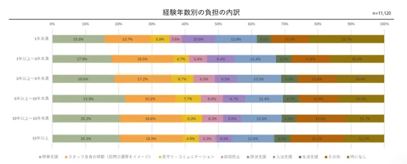他方、「負担が大きい」「課題である」と感じる業務を経験年数別でみると、ほぼ全ての経験年数で1位「移乗支援」、2位「スタッフ自身の移動」、3位「入浴支援」という結果に。経験年数が増えスキルを身に付けたところで、負担が下がるものではないようだ。