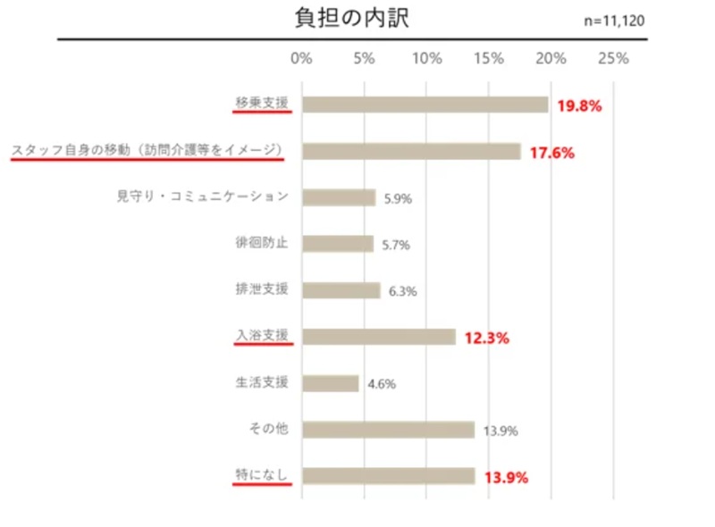 調査によると、介護の業務の中で最も「負担が大きい」「課題である」と感じているのは、利用者のベッド・車椅子・便座などへの移動の手助けをする「移乗支援」で、全体の約2割(19.8%)を占め、利用者の居宅を訪ねてサービスを行う訪問介護の「スタッフ自身の移動」が約18%、入浴の介助を行う「入浴支援」が約12%で続いた。一方で、「特になし(負担に感じる業務はない)」と答えた人も約14%いる。