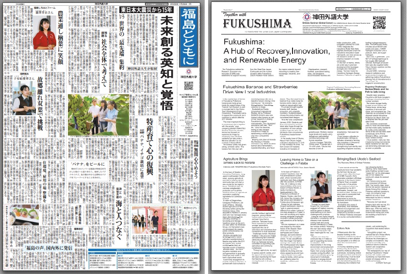 震災復興新聞は一般的な新聞と同じサイズのブランケット版で、表は日本語版「福島とともに」、裏面が英語版の「Together with Fukushima」。同大グローバル・リベラルアーツ学部の柴田真一特任教授のゼミに所属する3年生19人が制作に当たった。福島の過去、現在、未来を自らの視点で掘り下げ、日本語と英語で記録・発信する「震災復興発信プロジェクト」の一環。2025年8月には、津波と東京電力福島第1原発事故で大きな被害を受けた福島県沿岸部の浜通りを訪れ、取材した。