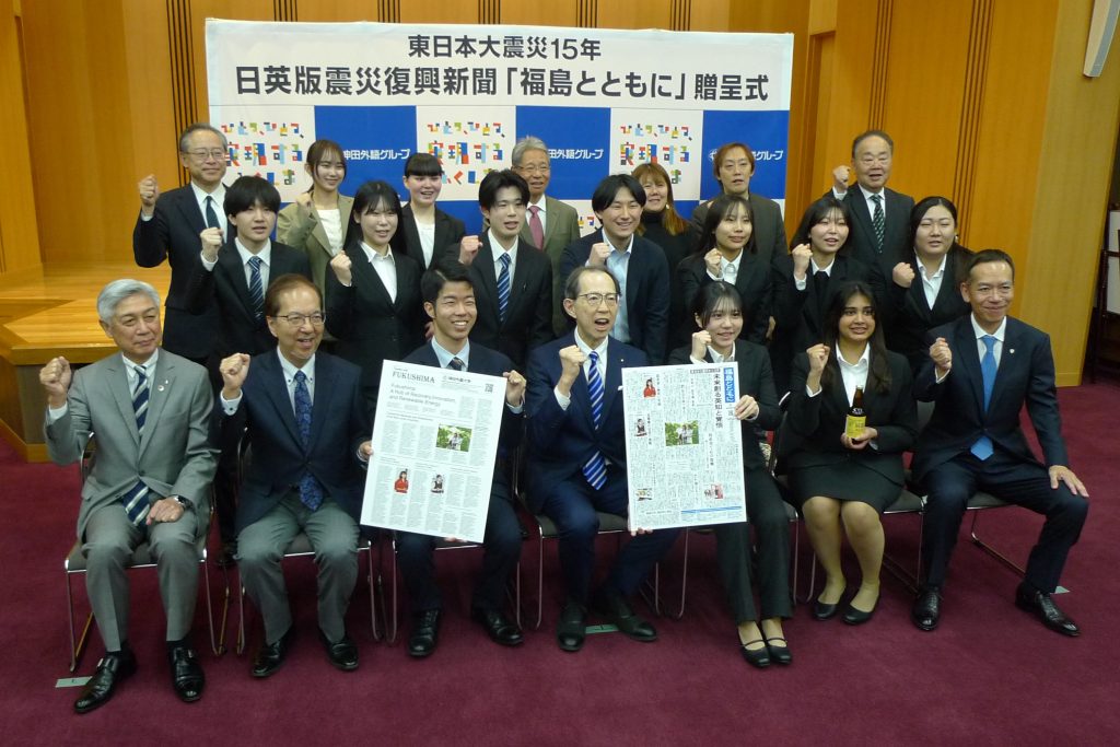 3月で発生から15年となる東日本大震災の被災地を取材し、復興の状況や人々の思いを世界に発信しようと、神田外語大(千葉市)の学生たちが取り組んできた日本語版と英語版の「震災復興新聞」が完成した。学生たちは1月26日、福島県庁で新聞を内堀雅雄知事に贈呈。今後、海外提携校へのプレゼンテーションなどで活用し、学生自身の言葉で福島の光と影を伝えていくという。