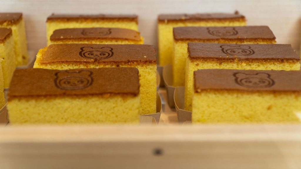 トレードマークのこぐまの焼き印が入った、できたてのカステラ