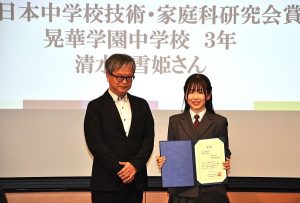 全日本中学校技術・家庭科研究会賞に選ばれた私立晃華学園中(東京都調布市)3年の清水雪姫さんは「一生懸命に書いた作文なので評価されてうれしい」と喜んだ。