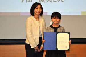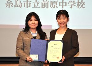 前原中は駒井千花さん、浪花茉里さんの両教諭が登壇し、賞状を受け取った。駒井さんは「およそ250人の生徒が作文を書いてくれました。弁当の日の取り組みでは自分だけの弁当を作れる生徒が増えています」と生徒の成長を実感できた喜びを語った。