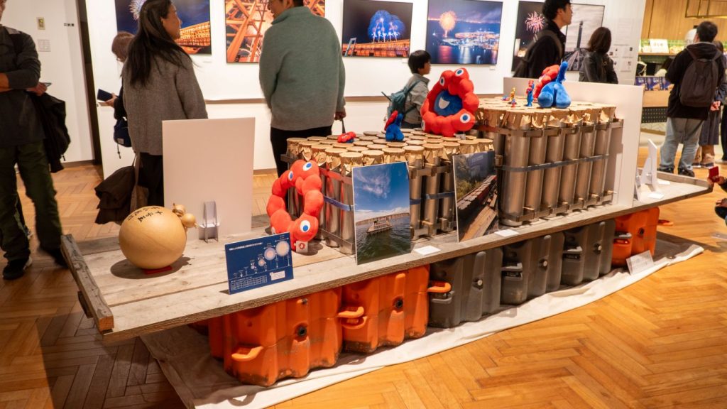 展示では、喜田さんと協力者のカメラマン3人が撮影した万博花火の写真20点余りのほか、つながりの海に浮かべた台船や発射台の実物、実際に使われた花火玉のレプリカなどもお目見えした。写真には、台船が映り込むなど、花火師ならではのアングルのものも。当時の花火を投影した動画モニターからは打ち上げ音が響いた。