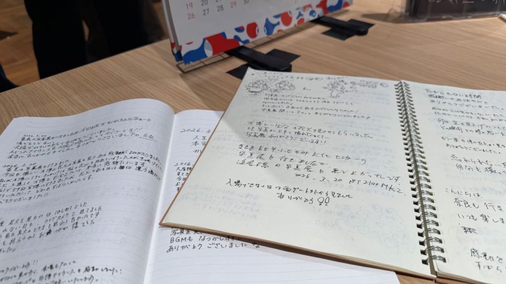 「一生分の感動をもらった、ありがとう」「楽しかった時間がよみがえり、涙が出そうになった」。大屋根リングの上で見た花火、パビリオンの中にいて音だけの花火、帰り道にゲート越しに見た花火――。会場に設けられたノートには、訪れた人それぞれが感じた“5分間の光”の思い出と感謝がぎっしりつづられた。