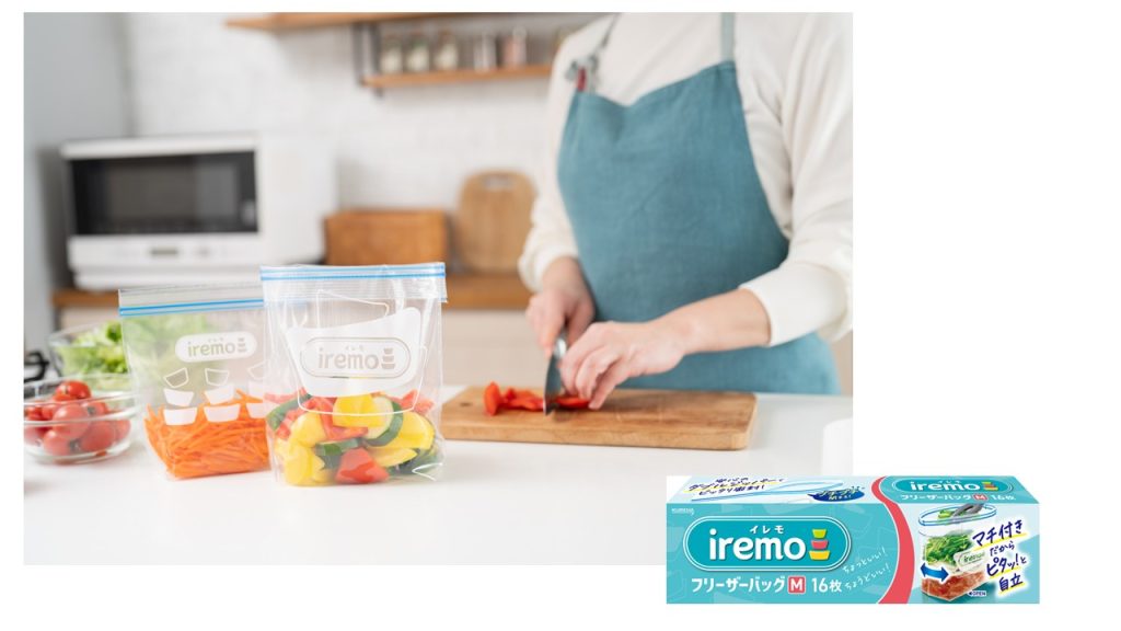 新ブランド「iremo(イレモ)」などの保存アイテムは、鮮度を長く保つことを追求しています。例えば、ダブルジッパーの「iremoフリーザーバッグ」は、冷凍やけを抑えて解凍後もおいしく食べられます。マチ付きで自立するので、忙しい時もサッと食材を入れられます。
