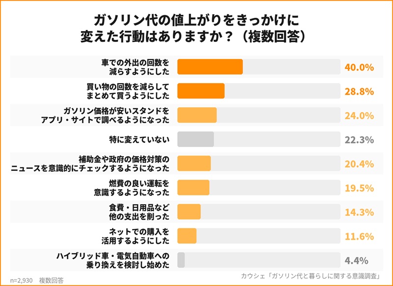 他方、1年前と比べたガソリン代の変化については78.5%が「増えた」と回答。それが行動変化にも現れ、「車での外出の回数を減らした」とする回答者が40%にも上るなど、ガソリン消費を抑える傾向が読み取れる。また、「まとめ買いに切り替えた」(28.8%)とする声も多く、買い物の頻度を減らすことでガソリン代を節約しようとする人が多い傾向があるようだ。