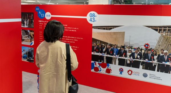 2025年大阪・関西万博を振り返る報道写真展が4月8日、大阪市のあべのハルカス近鉄本店ウィング館9階催会場で始まった。万博開幕から1年の節目に共同通信社が主催。誘致から閉幕までの報道写真に加え、万博愛好家が集めたスタンプやピンバッジ、パビリオンで使われたユニフォームやデバイスも展示しており、多くの人々でにぎわった。13日まで(最終日は17時閉場)。