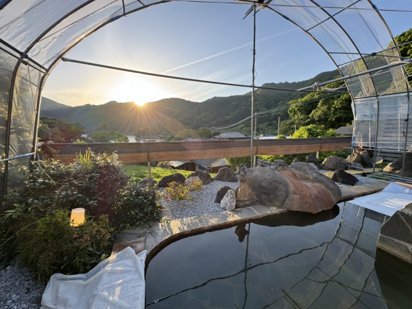 鰻温泉エリアで唯一という露天風呂からは、おだやかな鰻池と山々、集落が望めます。日中の景色も素晴らしいですが、夕方はサンセット、夜は星空を眺められ、1日でいろいろな表情を楽しむことができます。