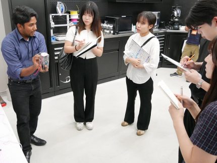 研究開発や人材育成で「創造的復興の中核拠点」となる福島国際研究教育機構(F-REI)の担当者に取材する学生(右列)=福島国際研究教育機構