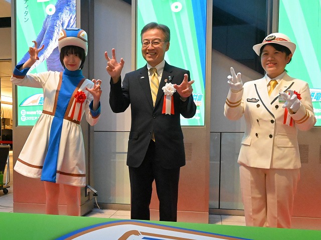 坂川さんは2023年に放映された北陸新幹線福井・敦賀開業1年前の記念ドラマ「はじめてのかがやき」に、自分を北陸新幹線最速型「かがやき」と名乗る不思議な少女役として出演。福井県の観光名所や名物を紹介している。25年9月には「ふくいブランド大使」に就任し、この日のセレモニーでは新幹線をモチーフにしたコスチュームで登場した。