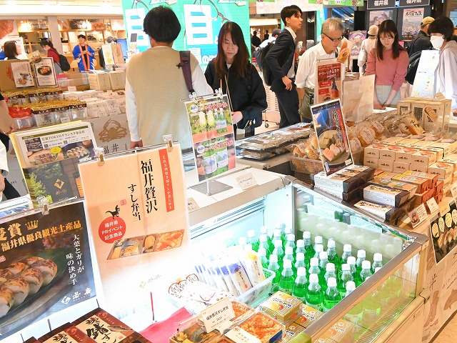 杉本達治福井県知事は、北陸新幹線が昨年3月に敦賀まで延伸された効果で「1割以上、多くのお客さまに福井を訪れていただいている」とあいさつした上で、恐竜や新米、越前そばなどの福井の魅力をアピールし「今日はここでちょっと福井を楽しみ、次はぜひ福井にお越しいただきたい」と呼びかけた。