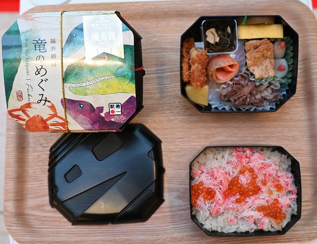 セレモニーで坂川さん、杉本知事、JR東京駅の前田美也子副駅長は、普段は北陸三県でしか販売していないというご当地駅弁「竜のめぐみ」も試食。福井サーモンのマリネを口にした坂川さんは「もっちりした食感で、脂も乗って食べやすい。素晴らしい」と笑顔で感想を述べた。