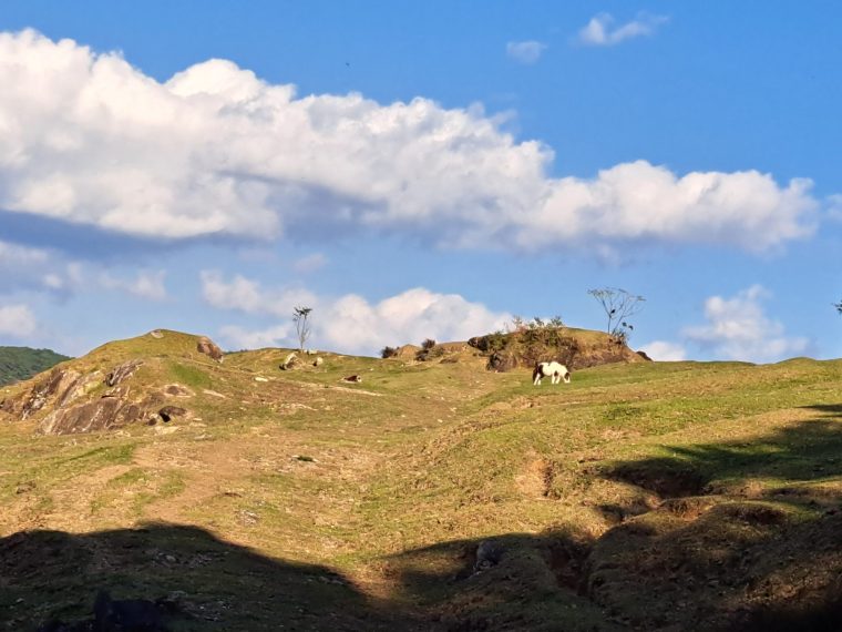 ポツンと1頭で草を食べる雪ヶ峰牧場のジャージー牛