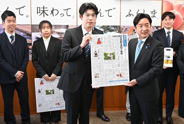 神田外語大(千葉市)の学生が、福島県内を取材し、東日本大震災からの復興状況を日本語版と英語版にまとめた震災復興新聞「福島とともに(英語版は「Together with Fukushima」)を、震災発生から15年を前にした3月4日、東京・霞が関の復興庁で瀬戸隆一副大臣に手渡した。