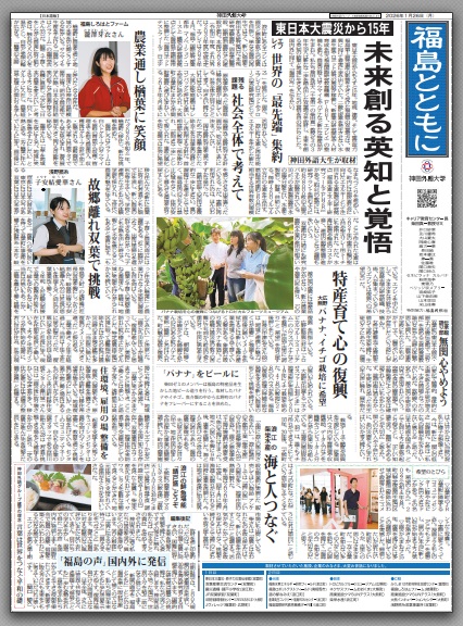 新聞を制作したのは同大グローバル・リベラルアーツ学部の柴田真一特任教授のゼミに所属する3年生19人で、同大が進める「震災復興発信プロジェクト」の一環。津波と東京電力福島第1原発事故で大きな被害を受け、復興途上にある福島県浜通り地域を2025年夏に訪れ、被災地の過去、現在、未来を自らの視点で掘り下げた記事にまとめた。