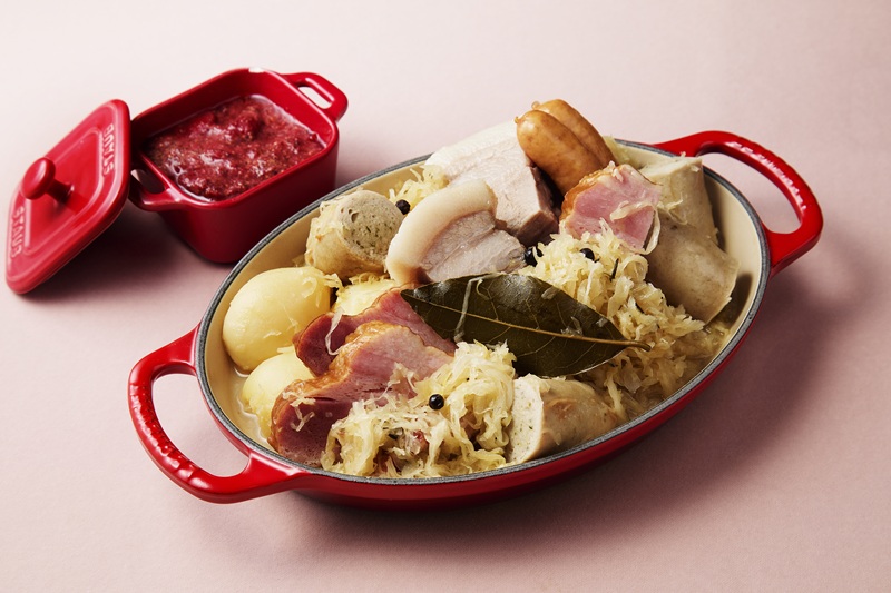 イチゴマスタード(左)を添えたフランスアルザス地方の煮込み料理「シュークルート」