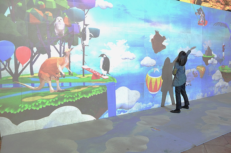 またロビー付近の壁や床に投影した、手や体を動かしたりすると動物キャラクターが動き回るプロジェクションマッピングは子ども連れのファミリーに人気で、親と一緒に小さな子どもが飛び跳ねたりしていた。