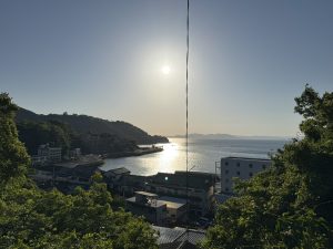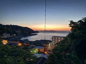 宿から見える不知火海と温泉街