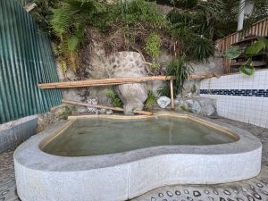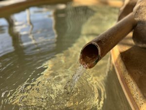 そんな個性的なお風呂に注がれているのは、自家源泉を加水・加温・循環なしで掛け流す新鮮な湯。泉質は、ナトリウム―炭酸水素塩・塩化物温泉です。透明なお湯は、ミネラル分が豊富なためか、わずかに白みを帯びて見えます。漂うのは、まろやかな塩のような香り。口に含むと、ほんのり塩気とうま味があり、薄いお吸い物を思わせる味わいです。肌ざわりはつるすべとしていながら、少しキシむような独特の感触もあり、湯の濃さがしっかり伝わってきます。身を沈めていると、成分の濃い湯が全身を包み込んでくるような心地よさがあり、湯上がりはさっぱりしているのに肌はしっとり。しばらく体の芯からぽかぽかと温かさが続きました。