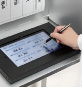 記載台に置かれたタブレットで候補者の名前をタップ、さらに「投票する」をタップして終わりだ。