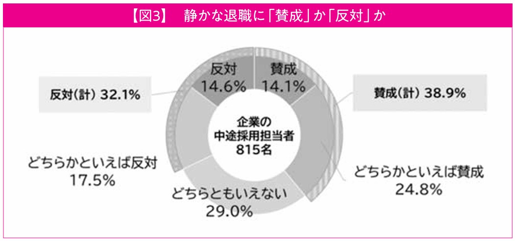 企業の中途採用担当者に対して静かな退職に賛成か反対かを聞いたところ、静かな退職に賛成している割合は38・9%となった。【図3】