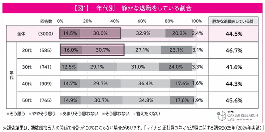マイナビが25年に実施した「正社員の静かな退職に関する調査」(回答数3千件)によると、全国の20~50代の正社員のうち44・5%が「静かな退職をしている」と回答している。特に20代ではその割合が高いが、どの年代でも4割を超えており、幅広い年代に存在することが分かった。【図1】