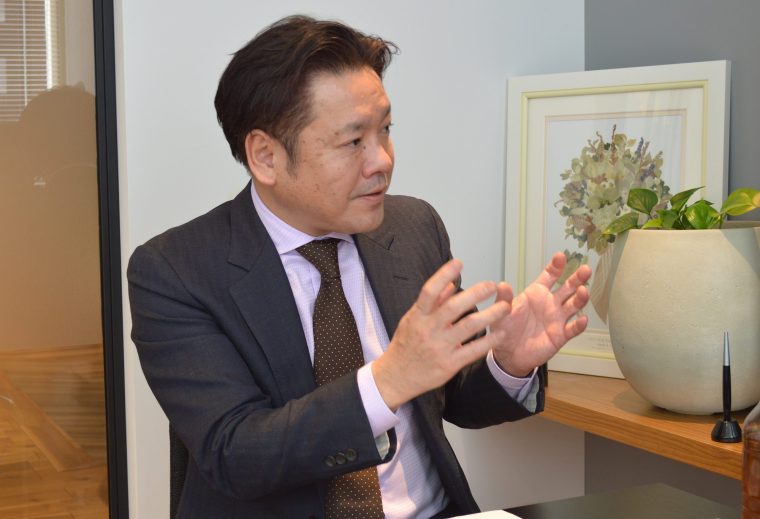 インタビューを受けるくふうウェディングの貝瀬雄一社長=東京都中央区、2025年11月17日