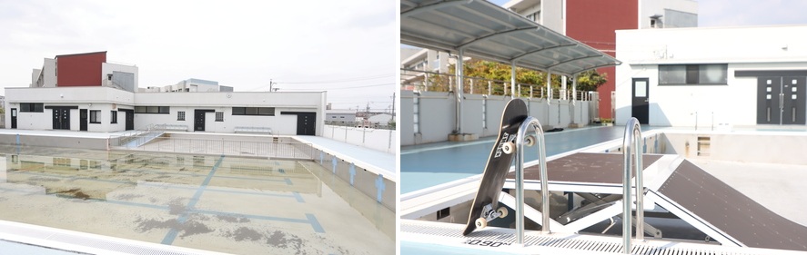 施行前のプール(左)、「スケートパークおおぶ」として開業