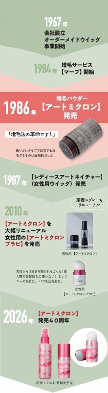 会社設立当初、男性専門のウィッグ会社として発足した当社は、その後「他に髪の相談をするところがない」という女性のお客様の声を受け、1987 年に女性用商品に進出。以来、ウィッグを中心に女性の髪の悩みに合わせた様々な商品サービスを展開しています。近年は通信販売に力を入れ、自宅で手軽に薄毛・白髪ケアできる増毛パウダー「アートミクロン」は大変人気です。(広報部)