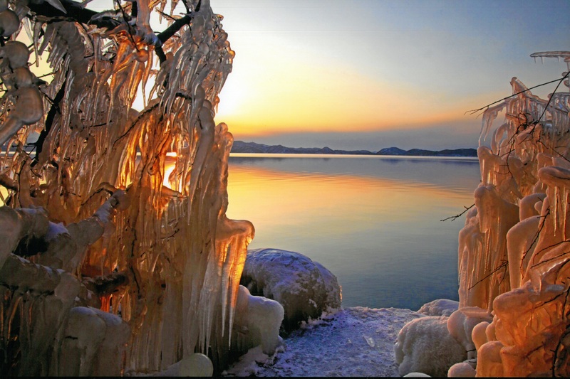 「しぶき氷」は、湖水が冬の強風にあおられて岸辺の樹木に氷着したもので、国内では極めて珍しい現象とされている。例年、1月から2月にかけて見られる現象で、日中や夕暮れなど、時間帯によっても見え方が変わり、幻想的な風景を楽しむことができる。