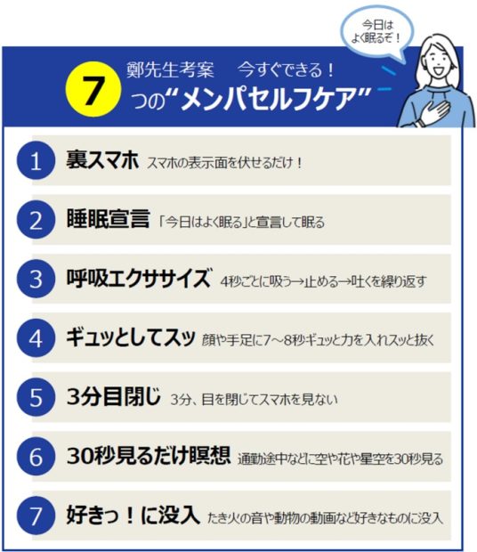 鄭氏が勧めるのが「メンパセルフケア」。「メンパ」は「メンタルパフォーマンス」の略で、心の消耗や不安、ストレスを減らすことを最優先するライフスタイルを指す。具体的に、以下の7つの「メンパセルフケア」を考案し、提唱している。