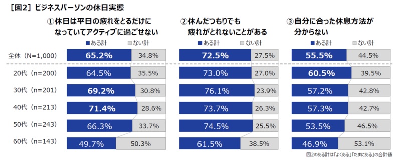 次に、休日の使い方についても聞いた。65.2%が「休日は平日の疲れをとるだけになっていてアクティブに過ごせない」と回答し、年代別では30代が69.2%、40代が71.4%と高い傾向に。また、ほぼ4人に3人(72.5%)は「休んだつもりでも疲れがとれないことがある」と回答した。