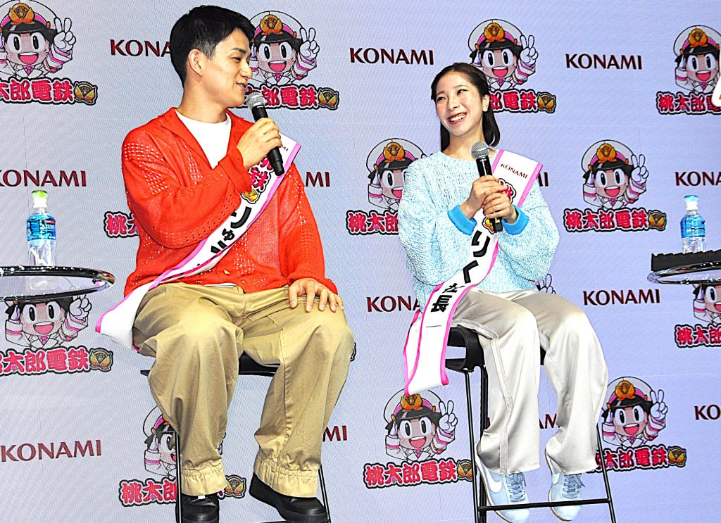 (左から)三浦璃来さん、木原龍一さん=東京都中央区のコナミグループ本社、2026年4月2日、コナミデジタルエンタテインメント提供