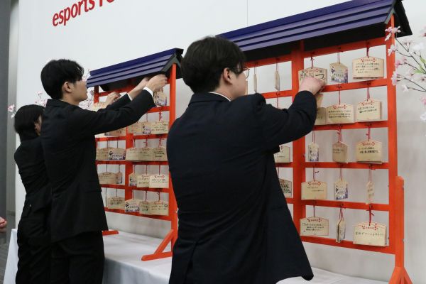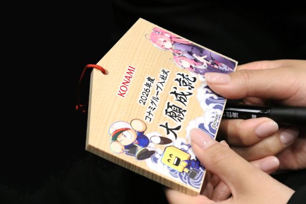 入社式では絵馬が配られ、新入社員全員が思い思いに入社後の抱負を記入。設けられた絵馬かけにかけて願かけを行った。新入社員の女性は「コナミグループのコンテンツが好きという気持ちを原動力に、その魅力を国内外の方に広く知っていただく仕事がしたい。人々の心に残る体験を生み出したい」、同じく新入社員の男性は「世界情勢など、未来のことを考えると明るい話題ばかりではないが、みんなが前を向いたり、少し安らげる時間を過ごせるゲームを作りたい」と期待を込めた。