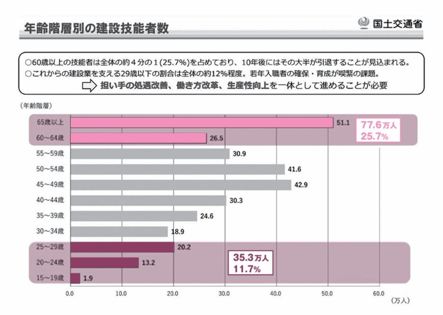 他方で29歳以下の割合は全体の1割ほどでしかなく、業界全体が「後継者不足」に直面している。今どきの若い人はみな「とりあえず進学」を選ぶため、土木分野の技術者や職人を目指そうという人自体がそもそもいない。