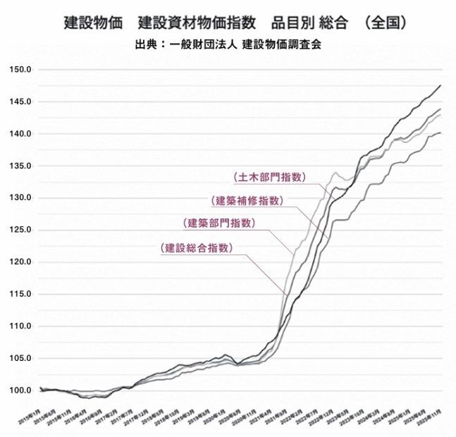 約10年前の2015年と比較すると、建材費はおよそ5割近く高騰しており、それこそ5年ほど前ならそれで入札が通っていたような工事も、今では受注してくれる業者がいないのだ。