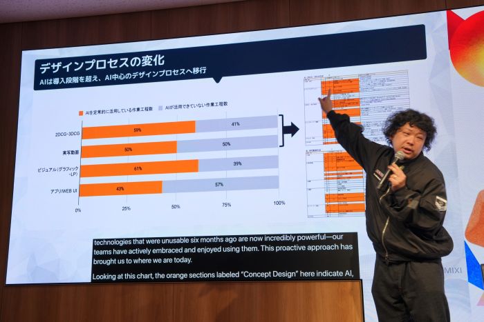デザイン本部がこの1年間で取り組んできた実践的なAI活用事例としては、UI(ユーザー・インターフェース)/UX(ユーザー・エクスペリエンス)のデザインで、対話型AIを用いたノーコードでの独自プラグインを開発し、レビュー時間を半減した例を紹介した。これにより、本来議論すべき「ユーザー体験」の追求に注力できるようになったという。また、CG映像制作でも、生成AIの活用により、制作期間とコストの大幅な圧縮に成功したことを紹介した。